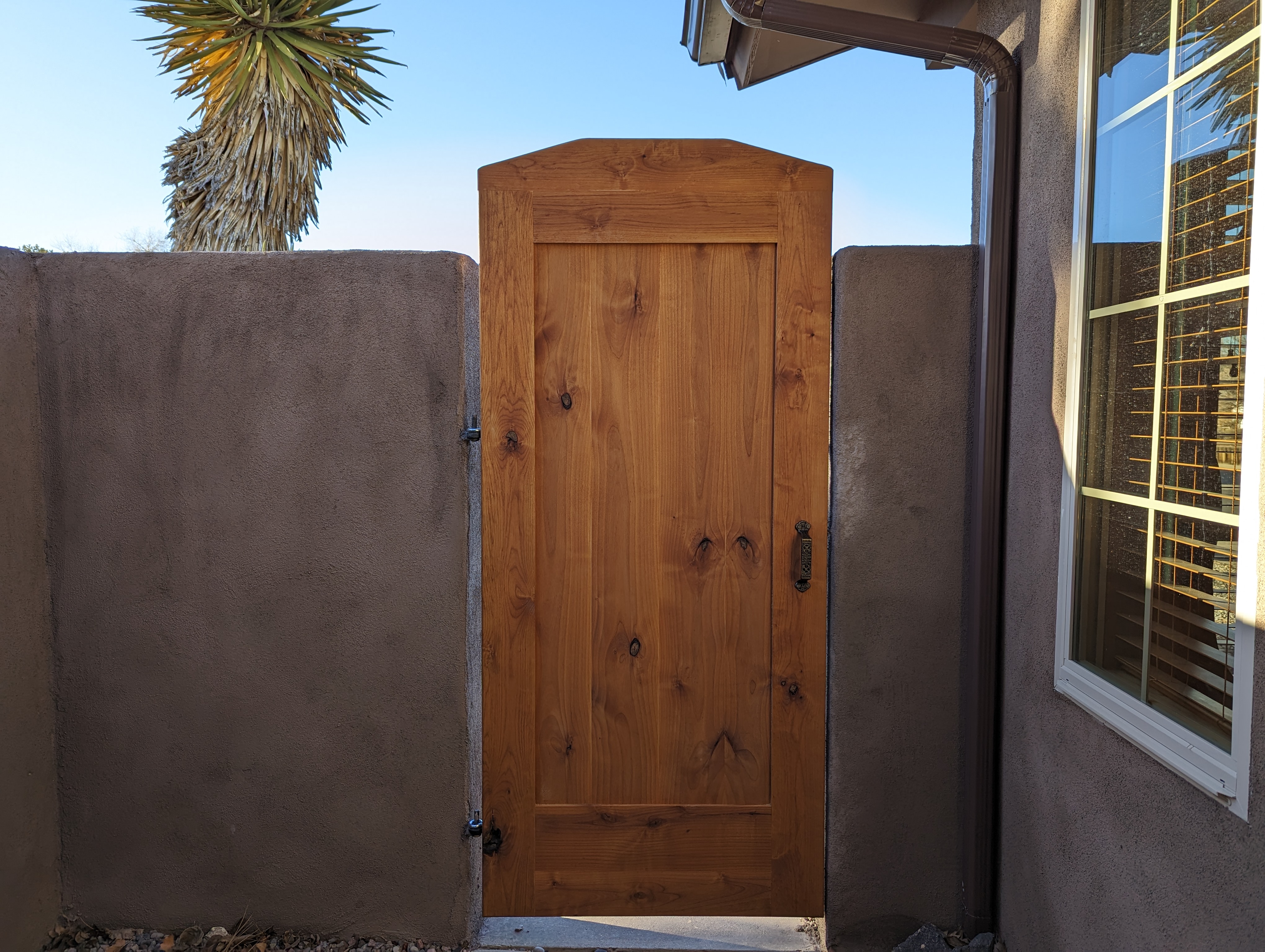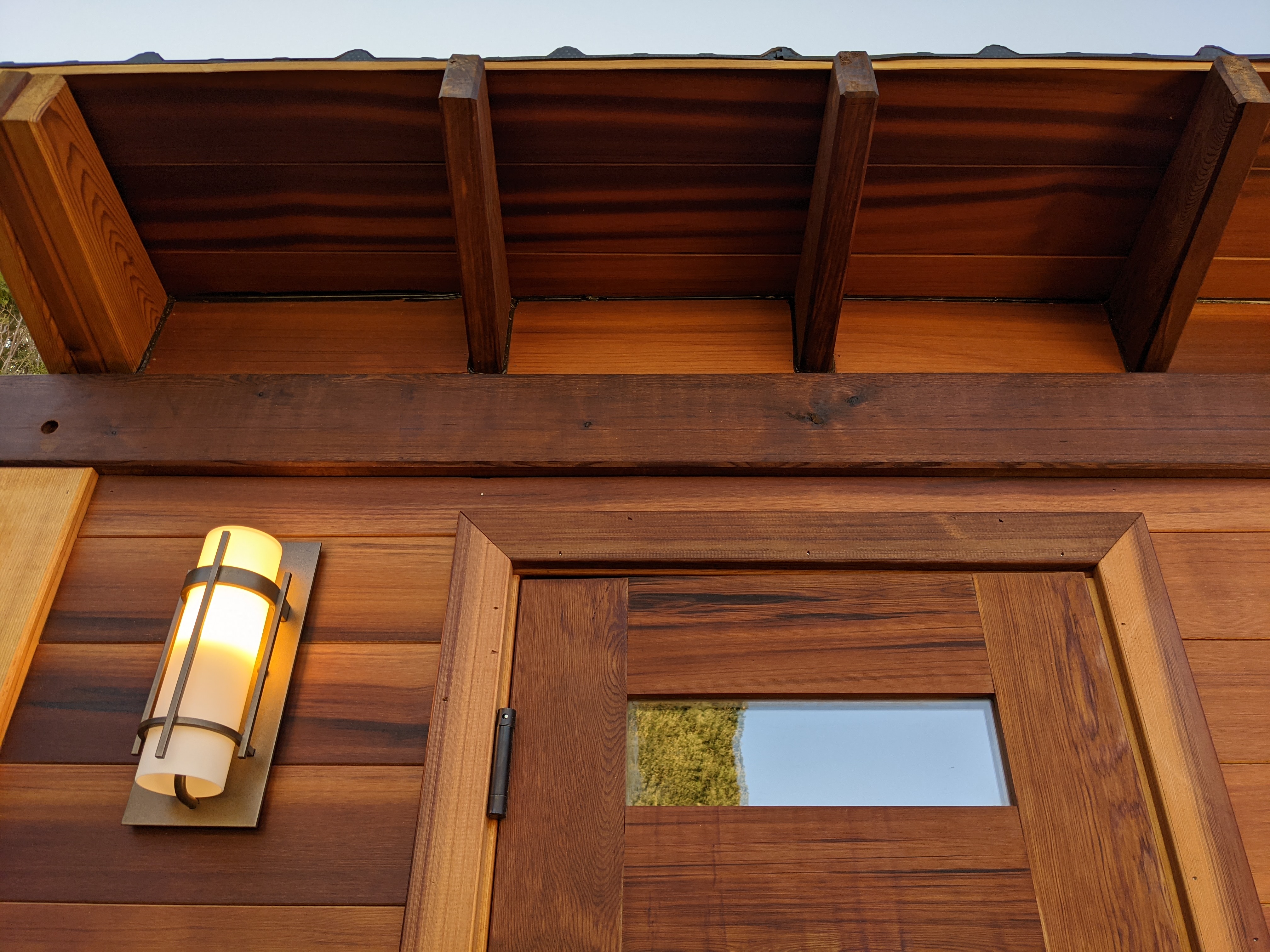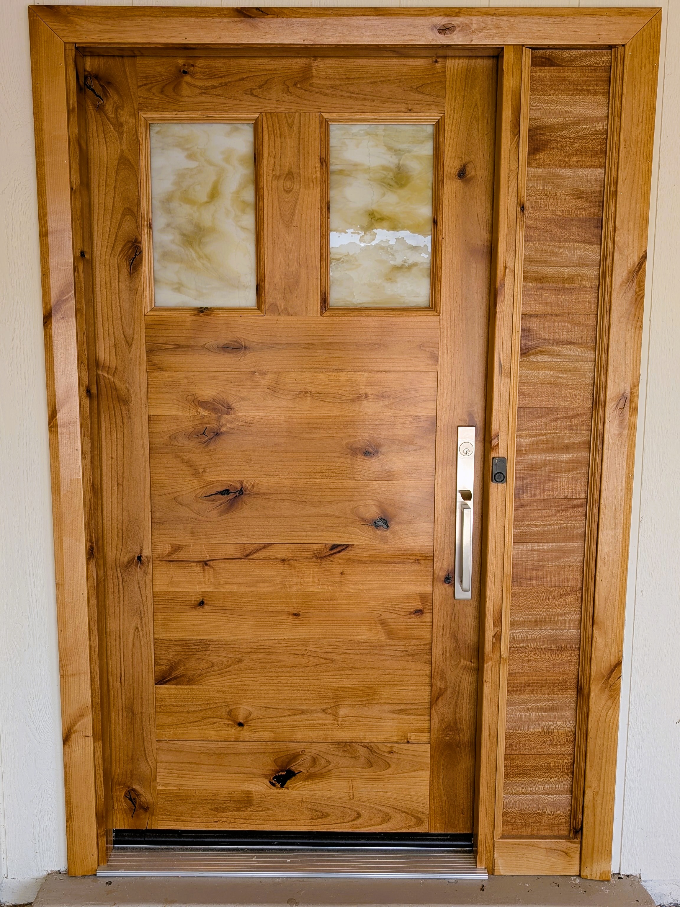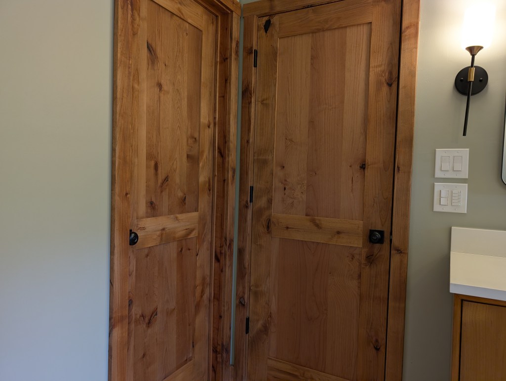 These custom entry doors are solid knotty alder wood with an oversized 40” width and a 2 1/8″ thickness. The Emtek handleset has a hand carved mortised lock box built into the door. Emtek offers several style options for the handleset. When you close the door you hear a solid ‘kerchunk’, a similar sound to the heavy car doors of the 1970’s when leaded gasoline was slowly making all of us sick.